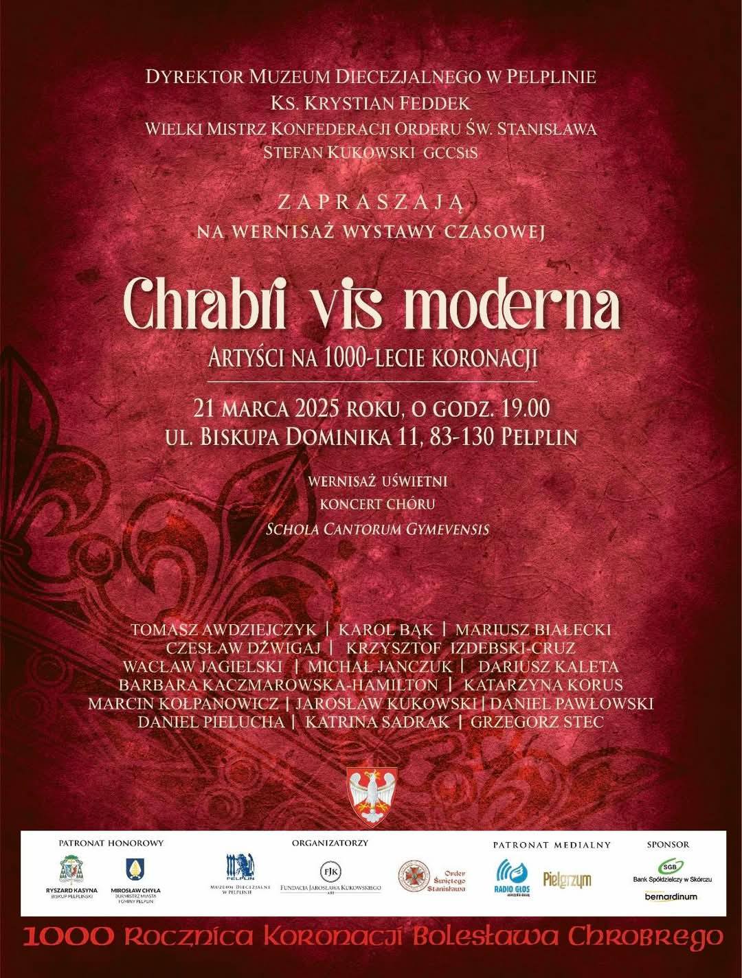 Daniel Pielucha – Nadrealizm Polski Muzeum Diecezjalne w Pelplinie otwierający obchody Milenium Koronacji Królów Polskich. Wernisaż wystawy „Chrabri vis moderna” odbył się 21 marca 2025 roku w Muzeum Diecezjalnym w Pelplinie z okazji 1000-lecia koronacji Bolesława Chrobrego i Mieszka II Lamberta. Wydarzenie rozpoczęło się o godzinie 19:00 i zostało uświetnione koncertem Chóru „Schola Cantorum Gymevensis”, który wykonał utwory, takie jak „Kyrie XI”, „Gloria laus” czy „Bogurodzica”.